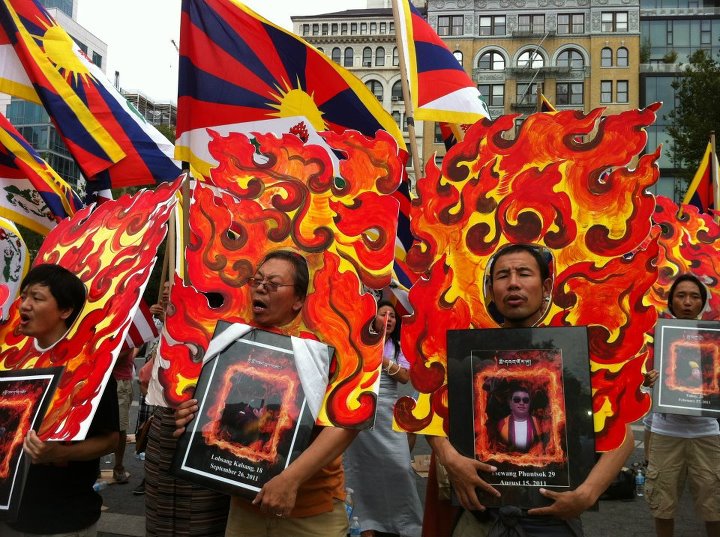 此外,居住在纽约与新则西的几十名流亡藏人和支持西藏人士也于上周六在纽约联合广场,手持西藏国旗、自焚藏人的照片、上身佩戴图画火焰的纸板,高呼西藏自由、停止打压藏人等口号进行游行示威。(录音)